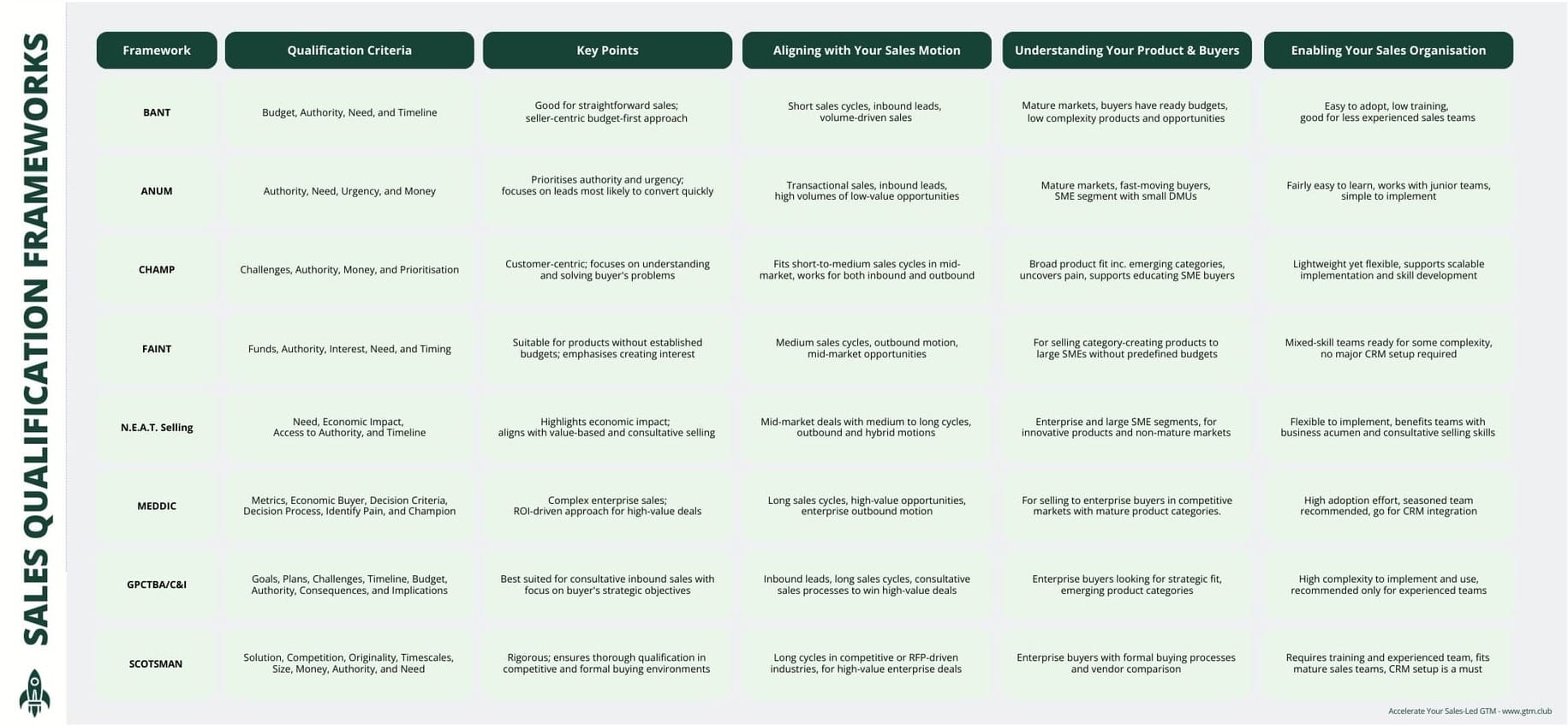 - Most advanced frameworks (MEDDIC, SCOTSMAN, GPCTBA/C&I) require significant investment in training, CRM customisation, and ongoing coaching support.